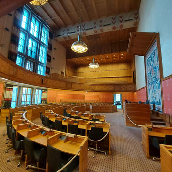 Puis on a suivi Johan pour une visite guidée et commentée des lieux aux espaces imposants, riches en histoire sur le pays indépendant depuis seulement 1905, grâce à des fresques monumentales jusque dans la salle du conseil municipal.